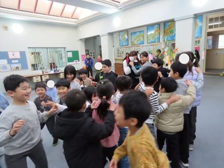 最後に全員が円になって目をつぶって立ち、司会が織姫と彦星を後ろからそっと他の子にわからないように指名して、それを探してチェーンをつくるというゲームをしました。