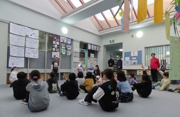 G4の熱演による七夕の劇と、劇の途中で出されるクイズで、小学部のみんなは大いに盛り上がりました。よく知っているはずの「七夕」の話ですが、G4のみんなが出すクイズで迷う場面もあり、とてもおもしろかったです。