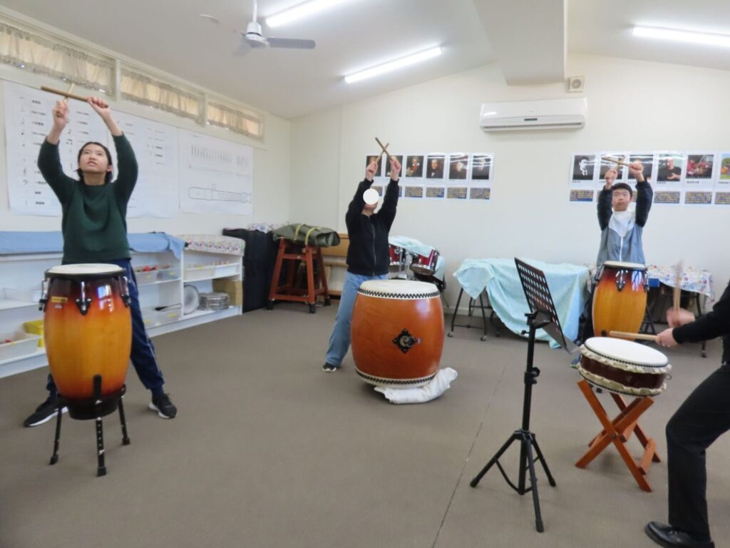 中学部 音楽「和太鼓」 2025年7月11日 principal 中学部は音楽の授業で和太鼓の演奏に取り組んでいます。G9はこれまでの経験を生かすことができますが、G7にとっては初めて取り組む和太鼓です。構え方、バチの持ち方、腕の振り、叩き方など、実践を通して学んでいるところです。9月に行われる創立40周年をお祝いする会(メル校デー)まで練習を重ねて、素晴らしい演奏を披露してくれることと思い、楽しみにしています。