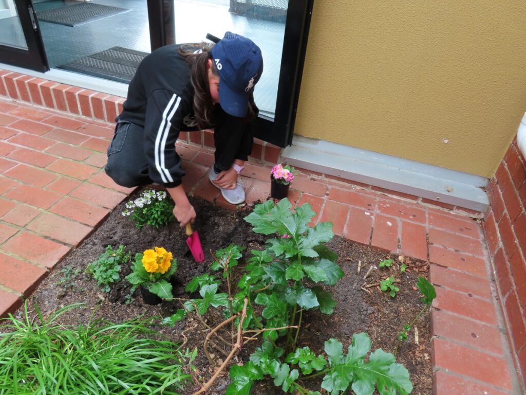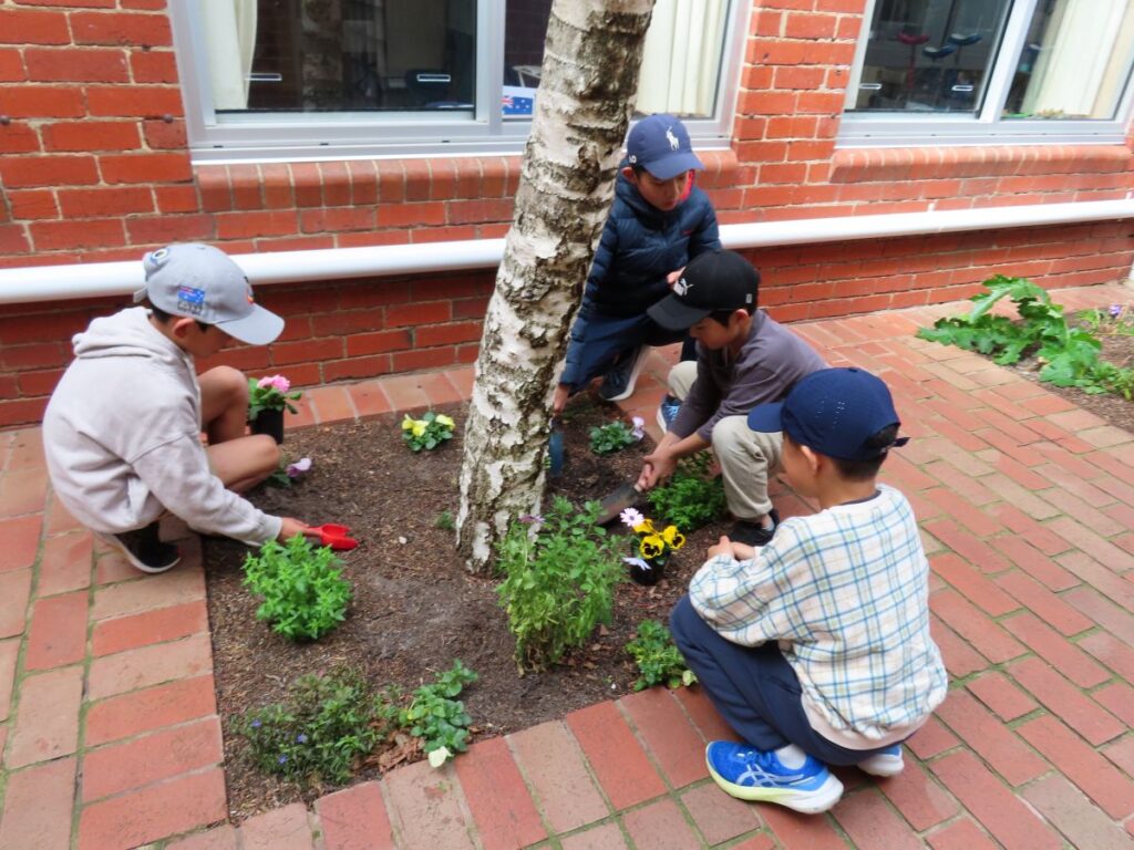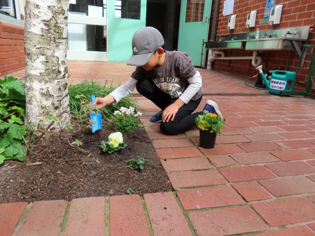 健康委員会のメンバーがいつも水やりをしてくれているフラワーロードですが、委員会で「フラワーロードっていう名前なのに、あんまり花がないよね。」という話題が出て、色とりどりの花を植えてくれました。「ここ、木の根っこがあって、なかなか掘れないよ。」「色の組合せを考えたら、この花はこっちの方がいいんじゃない?」などと言いながら、植え込みが完了!地味だったフラワーロードが、一気に華やかなフラワーロードに大変身しました。健康委員会のみんな、どうもありがとう!