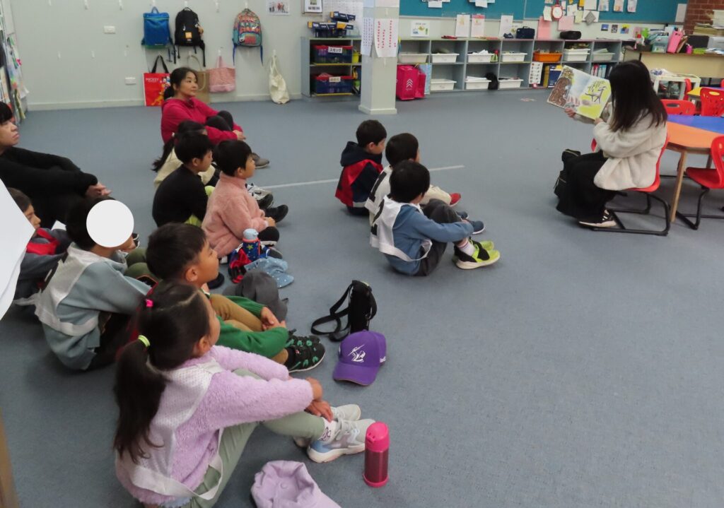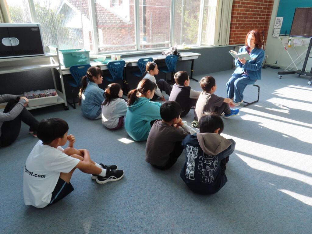 保護者の方による読み聞かせの会がありました。プレップ・G1・G2は「三びきのヤギのがらがらどん」と「ハンタイおばけ」を読んでいただきました。「三びきのヤギのがらがらどん」は、主人公の3匹のヤギが山の草を食べに行くために橋を渡ろうと、トロールに立ち向かう話です。リズミカルな擬音語に子供たちがどんどん引き込まれていきました。「ハンタイおばけ」は子供たちが大好きな絵本です。次の展開を予想しながら読んでもらう子供たちの表情がとても生き生きとしていました。