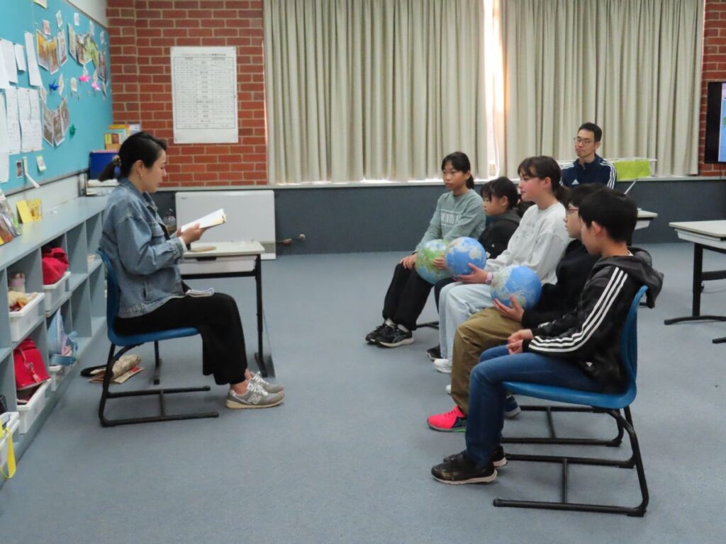 G5・G6は「13歳からの地政学~カイゾクとの地球儀航海~」を読んでいただきました。高一の大樹と中一の杏の兄妹が「カイゾク」と呼ばれる近所のアンティークショップ店主から受けた7日間のレッスンとは?「地政学」がわかれば、歴史問題の本質、ニュースの裏側、国同士のかけひき・・・が見えてくる。子供も大人も知っておきたい世界のしくみがわかる一冊です。私たちがふだん当たり前に見ている日本が中心の世界地図、でも国が違えば地図も違う・・・子供たちはそんなことを、持ってきてくださった地図や地球儀を実際に見ながら聞いたり考えたりしていました。最後に「カイゾク」からの質問です。「自分にとっての世界の中心はどこだろうか?」・・・みなさんならどう答えますか?
