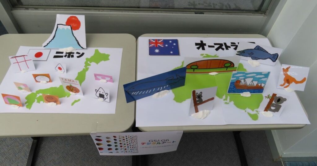 すてきな図工作品の数々 2025年10月13日 principal 教室前の掲示スペースにすてきな図工作品が並んでいます。G3・4は筆ペンで描いたアート作品。なんと一時間で仕上げたということですが、それぞれの作品に個性が出ていて、どれも芸術作品ですね。 G5・6はデジタルアート。子供たちがイメージした「日本」と「オーストラリア」を表現しています。平面なのに立てることによって、より具体に迫ってくる感じがすてきですね。
