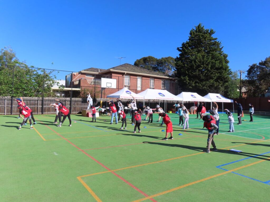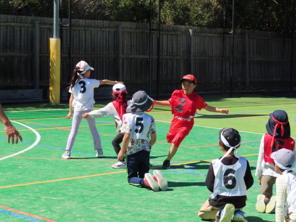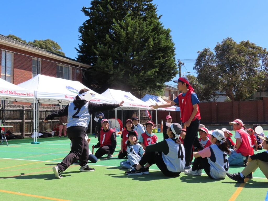 清々しい青空の下、運動会予行練習が行われました。朝から赤も白も気合十分!