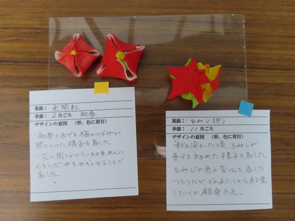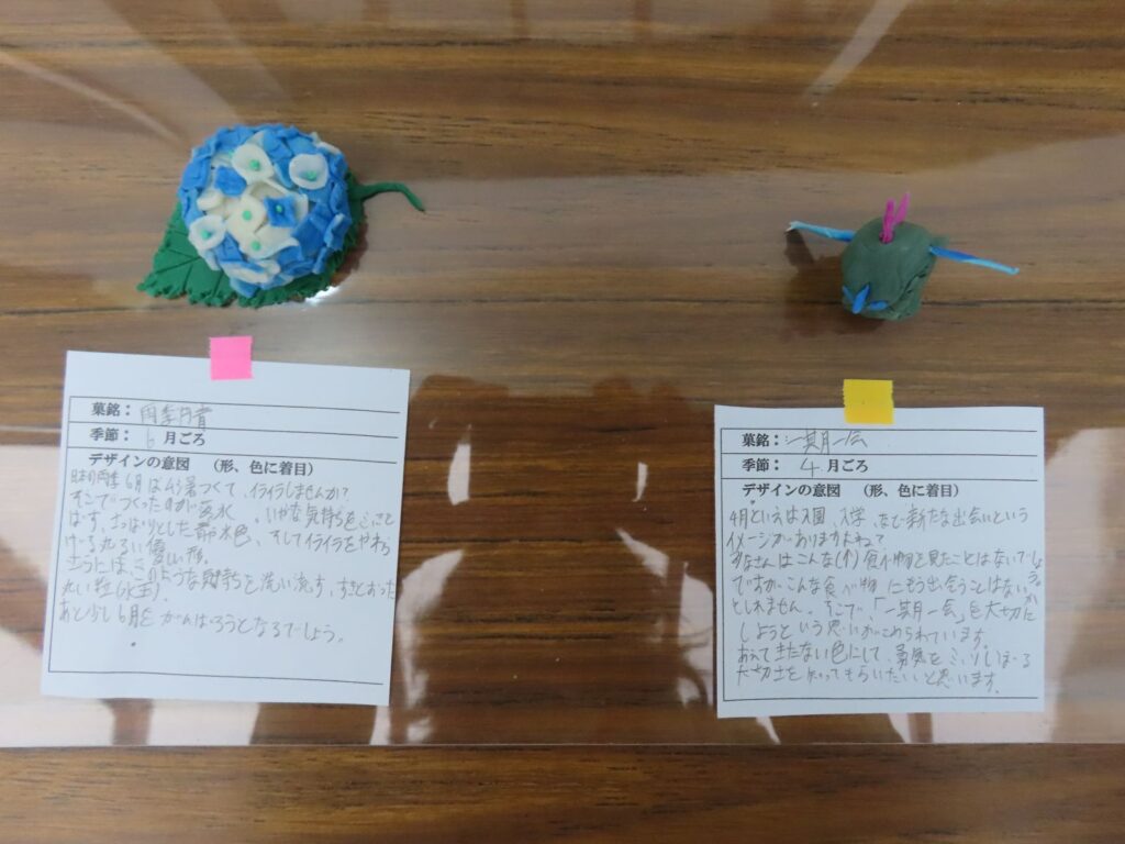 中学部の美術では、季節を表す和菓子を作りました。四季それぞれの季節感があって、間違って食べそうになるくらいリアルな美しい出来栄えです。