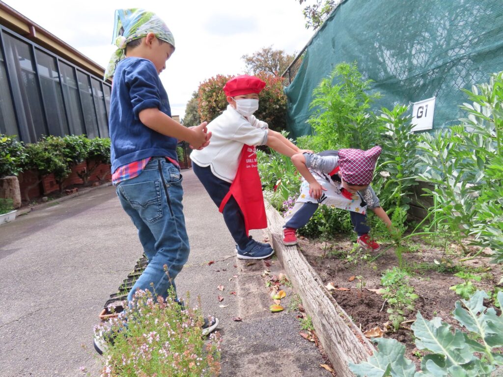ますは野菜の収穫です。ニンジンさんはなかなか抜けず、みんなで「うんとこしょ!どっこいしょ!」