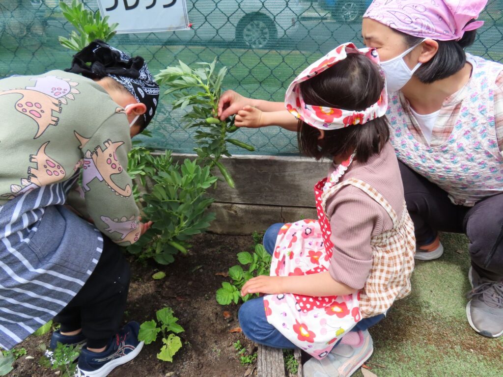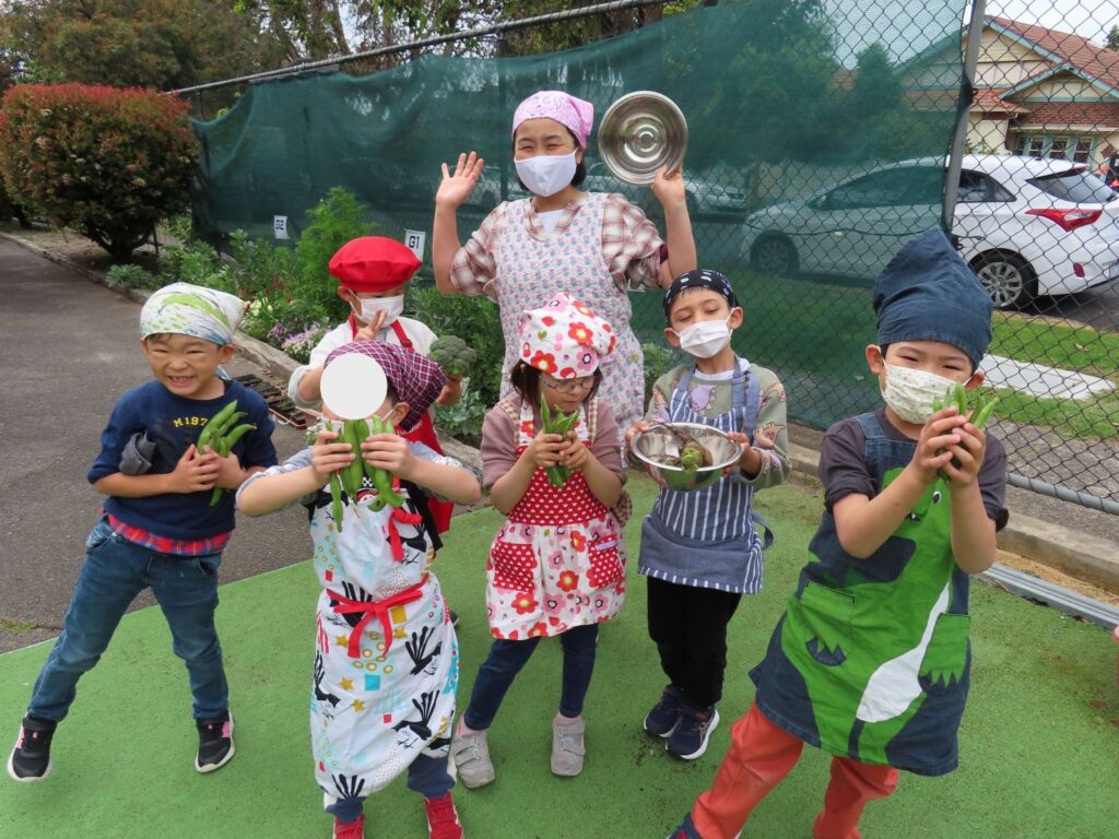 プレップみんなで大切に育ててきたそら豆、ニンジン、ブロッコリーが大きく育って食べごろを迎えました。日頃から食育に力を入れているプレップは、先日自分たちでうどん作りに挑戦し、「だし」のおいしさを知りました。今回はその「だし」を使って、おみそ汁を作り、自分たちで育てた野菜を具として入れることにしました。