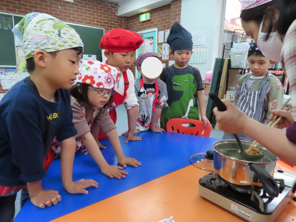 野菜を洗って、切って、だしを作った鍋に入れて・・・野菜が柔らかくなったらいよいよお味噌を入れます。「あ~、だしのいいにおいがする~!」まるで一流料理人のような言葉が聞こえてきました。