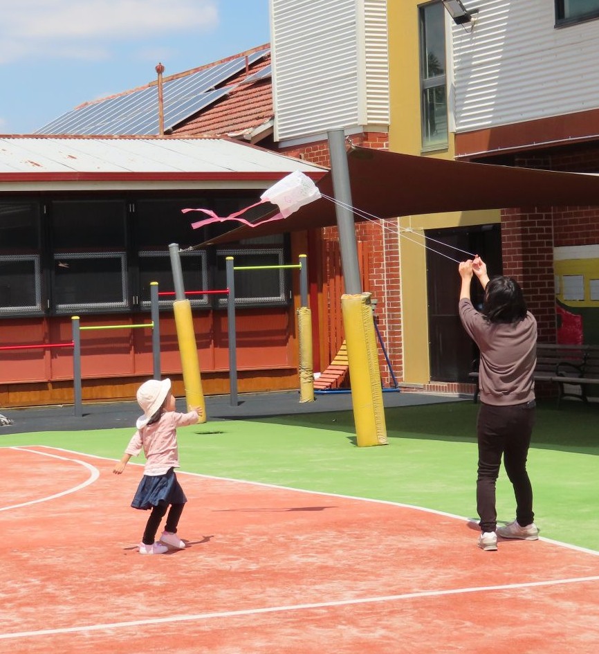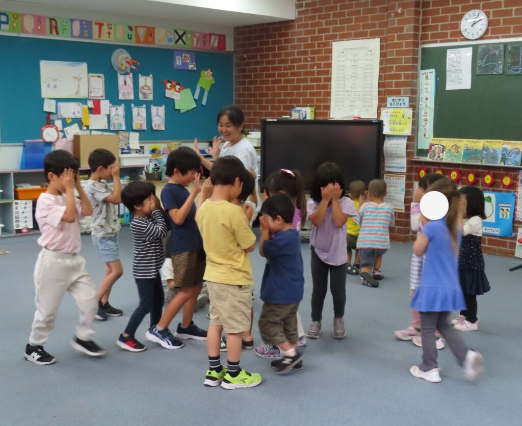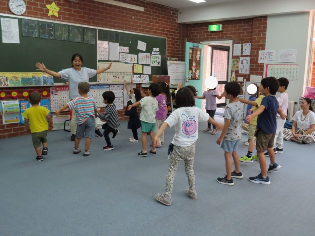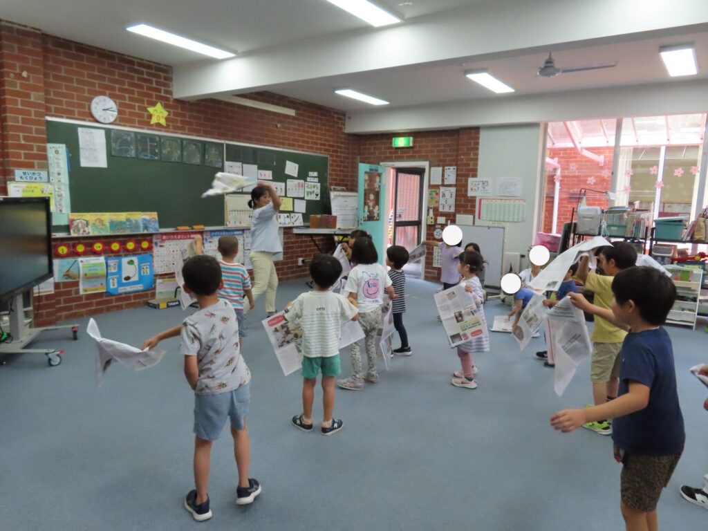 1月の幼児教室は「たこあげ」をしました。まずは、たこあげのリトミックで体を動かして遊びました。新聞紙をたこに見立てて「♪た~こ~ た~こ~ あ~がれ~♪」と歌いながら、グルグル回したりど~んと落としたり、子供たちはみんな楽しそうに踊っていました。