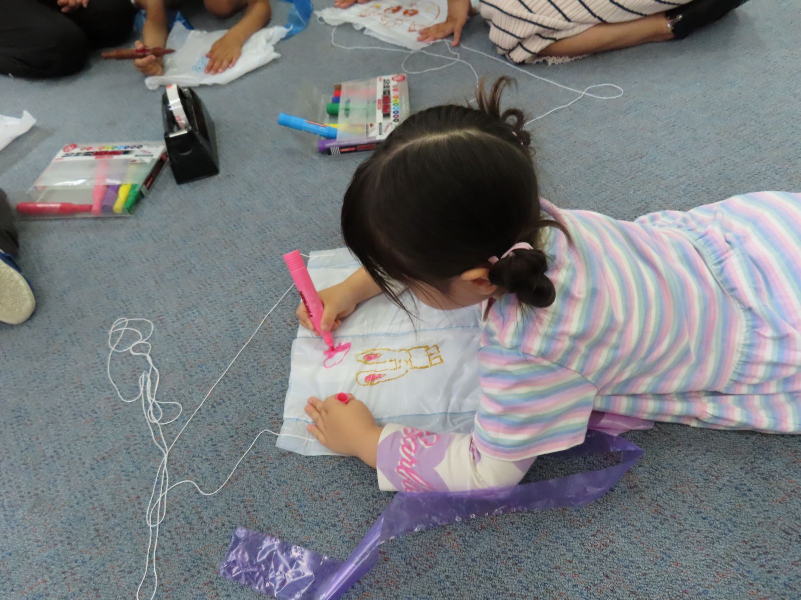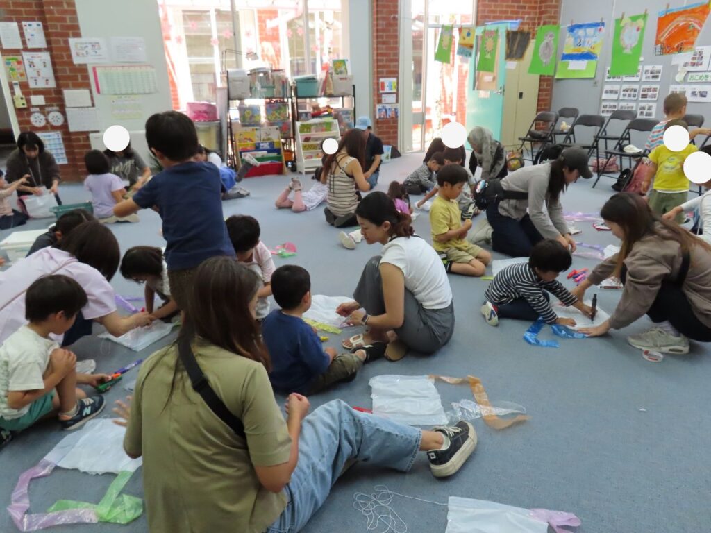 次にいよいよ「たこ作り」に挑戦です。親子で協力しながら、たこを組み立てたり、絵を描いたりして、素敵なたこが出来上がりました。