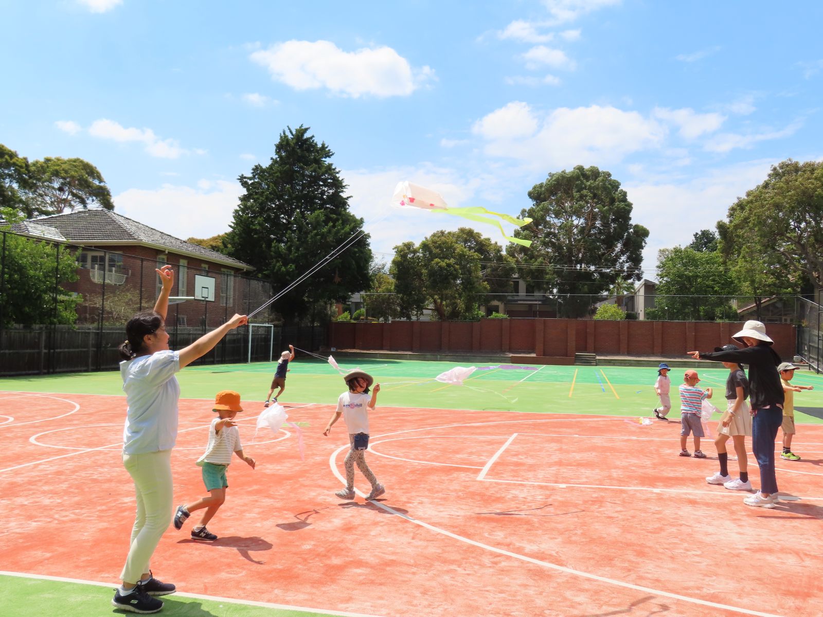 今日はとても良いお天気で、たこあげにピッタリな風が吹いてたので、青空の下で子供たちの作ったたこが気持ちよさそうに泳いでいました。
