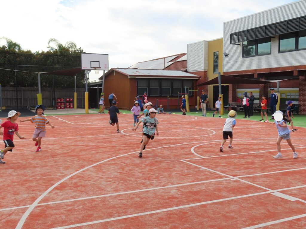 今年度最後の縦割り活動が行われました。いつもは4つのグループに分かれて、高学年が考えてくれたゲームで活動をするのですが、今日は最後なので全員でメモリータグをして遊びました。いろいろな作戦を考えてタッチされないようにしたり、油断している友達の後ろからそっと忍び寄ってタッチしたり、広い運動場を走り回って楽しい時間を過ごしました。