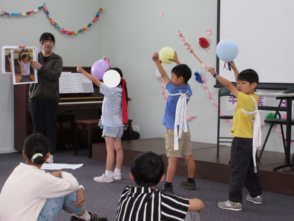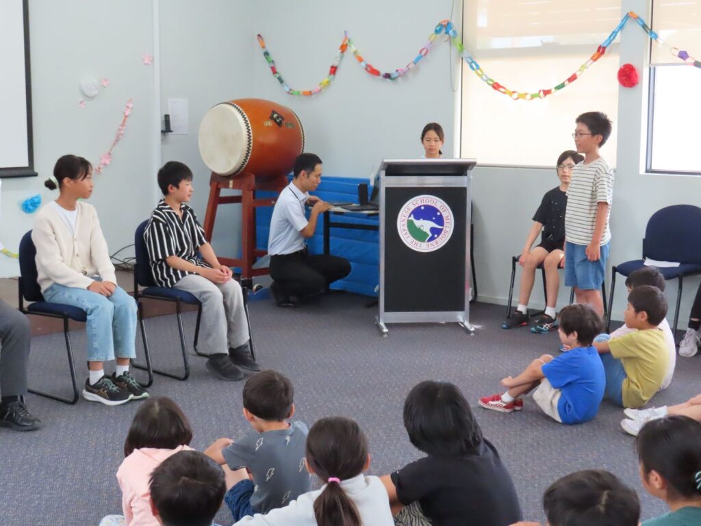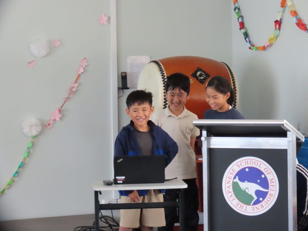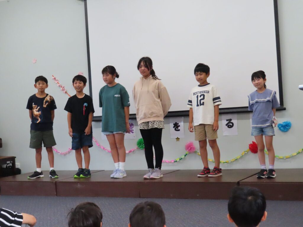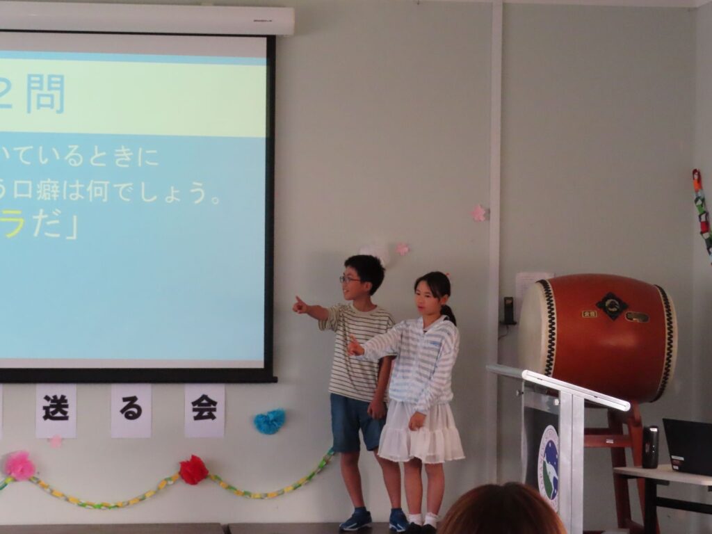 みんなが家族みたいなメル校です。G6のお兄さん・お姉さんのこともよく知っていて、得意なことや好きな物はもちろんのこと、ちょっとした秘密まで、クイズにしたり劇にしたりと大盛り上がりしました。「いっしょにおどりましょう!」とダンスに引っ張り込まれる場面もあり、G6の二人はみんなに愛されているなあと感じました。それもこの一年間、G6が下級生のことを常に考えながら、リーダーシップを発揮して優しく思いやりをもって接してくれていたからなのでしょう。