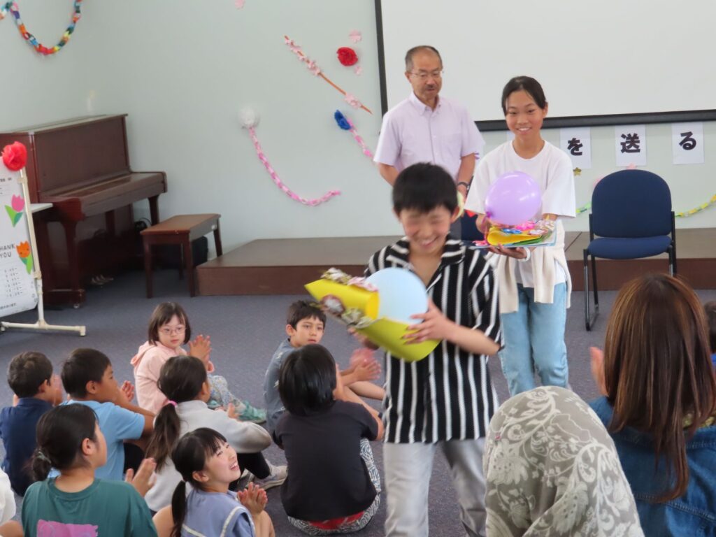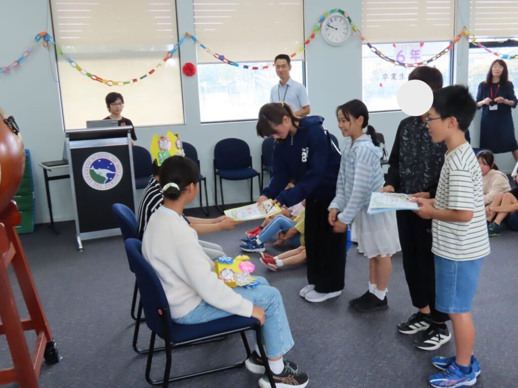 プレップからG5までの出し物が終わり、プレゼント渡しの時間です。低学年が心を込めてつくった冠と全員のお手紙が「ありがとう」の気持ちを込めて手渡されました。