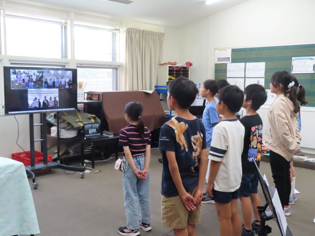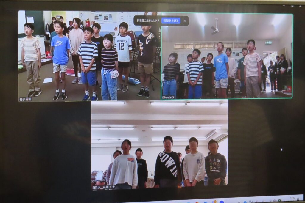 白浜小学校は、「陽気な船長」をリコーダーで演奏し、「小さな世界」と「旅立ちの時」を歌ってくれました。メル校は、「Advance Australia Fair(オーストラリア国歌)」と創立40周年記念ソング「僕らの物語(ストーリー)」を歌い、「青と夏」を合奏しました。日本とオーストラリア、遠く離れたところからのそれぞれの演奏なので、画面越しでしたが、お互いの演奏を聞き合いながら、だんだん心がつながっていきました。