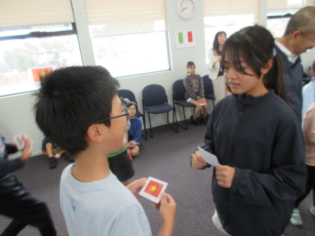 そして、G4から国旗のカードが配られ、小学部のみんなでマッチングゲームを行いました。ジャンケンをし、あいさつをし、同じ国のカードをもっている人を探すゲームです。先生たちも入って大盛り上がりしました。