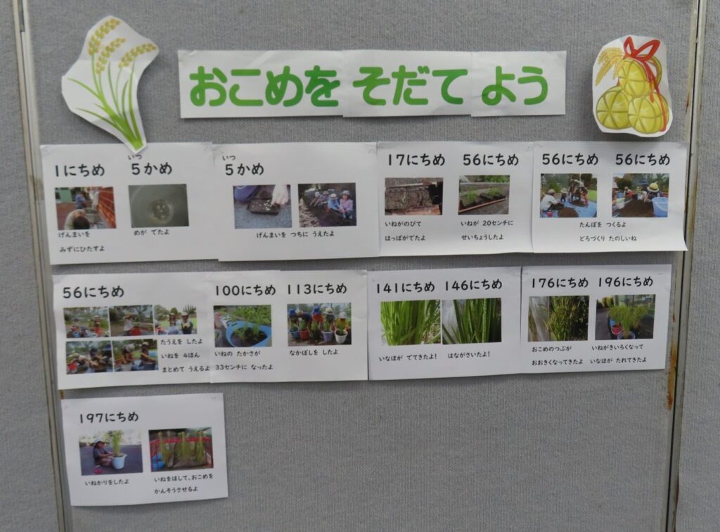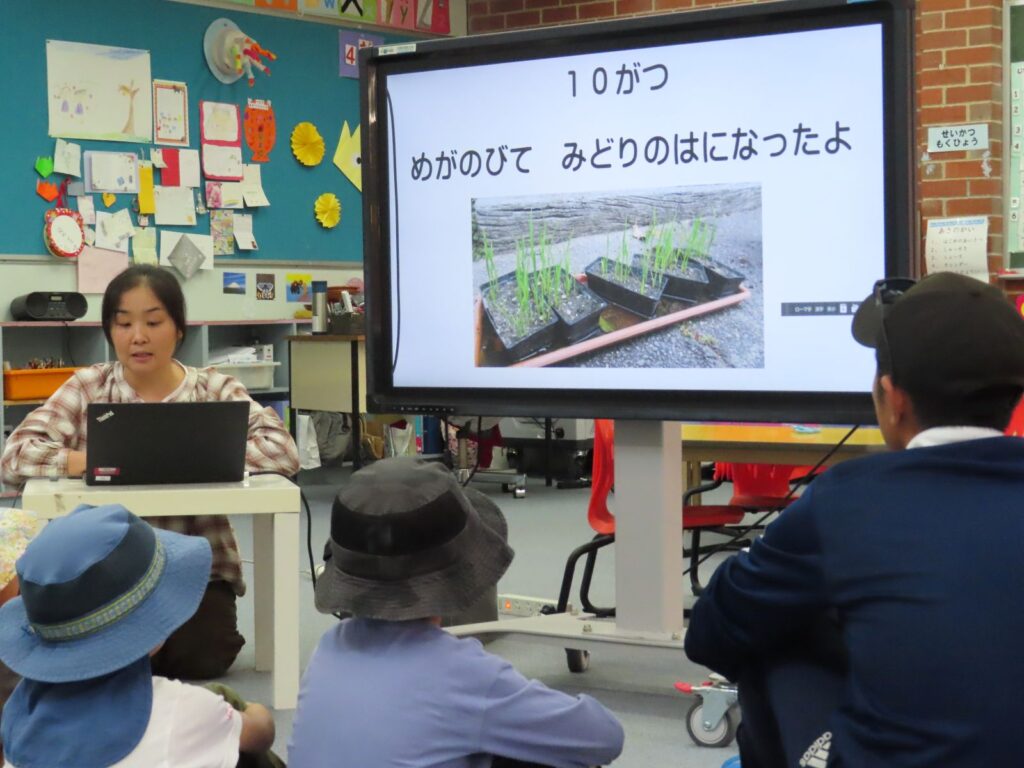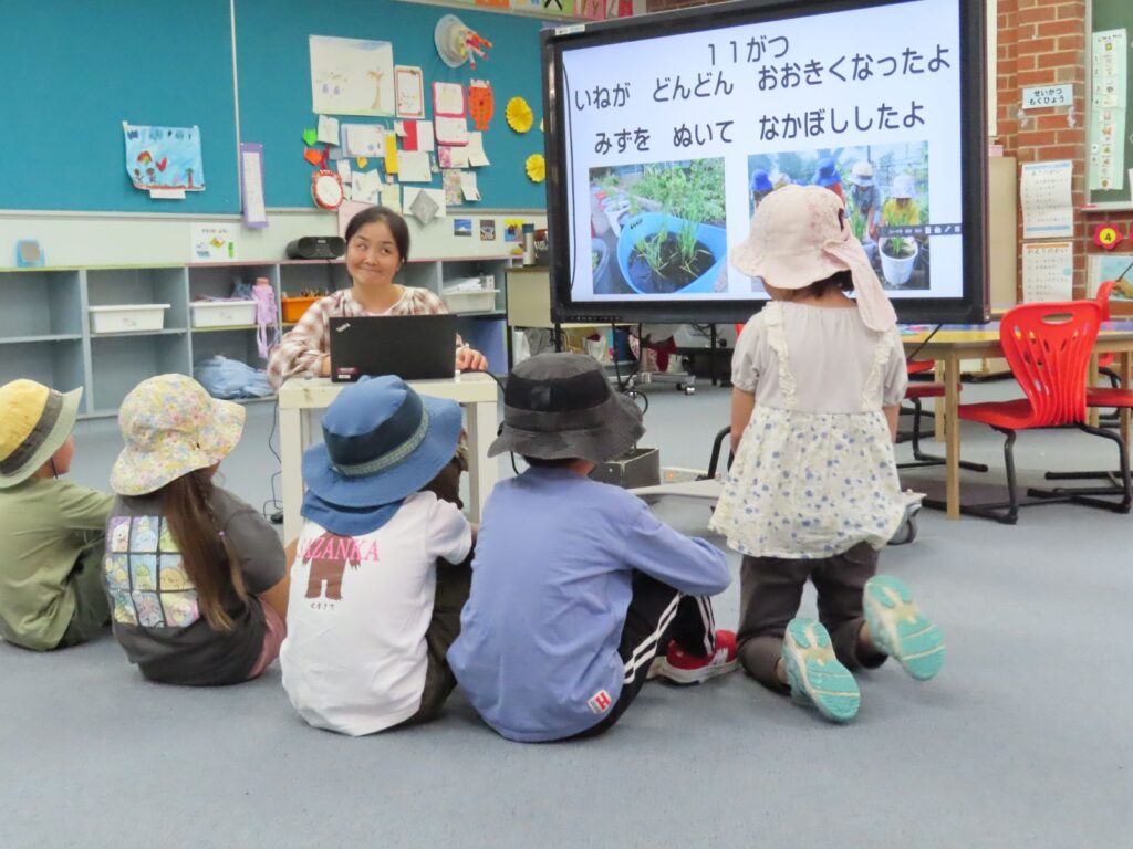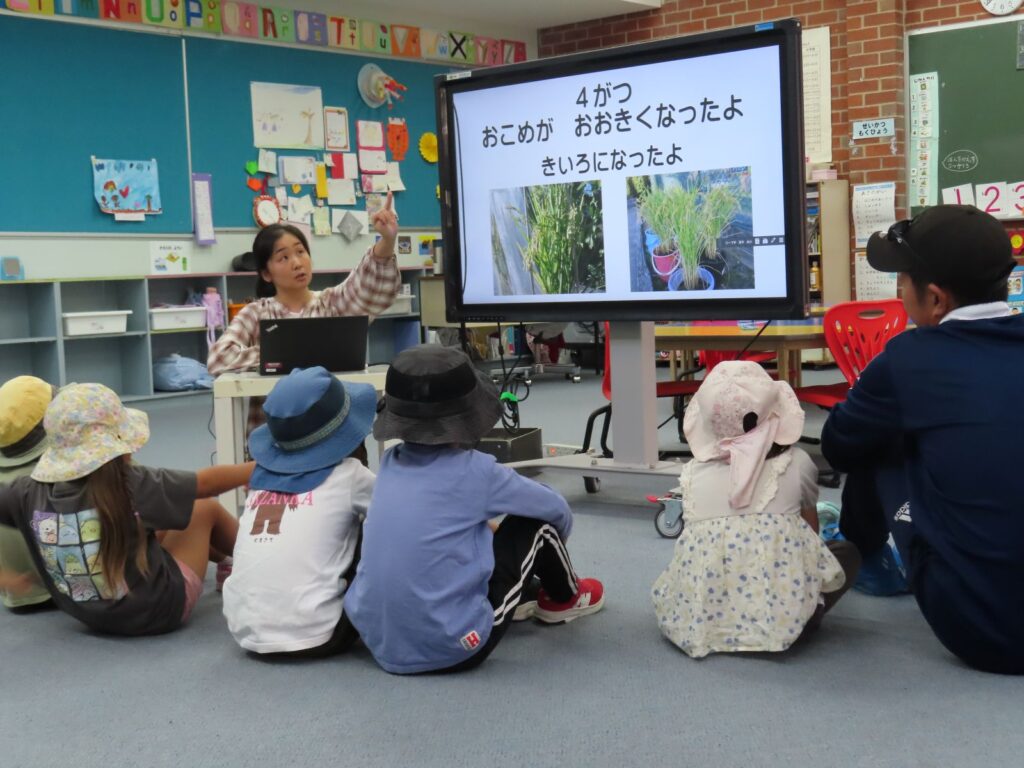 今のG1がプレップの時の9月に、種もみから大切にお世話をして育ててきた稲が実りの秋を迎えました。197日目の今日は稲刈りの日です。最初に教室で、これまでの稲の成長の様子やお世話を振り返りました。