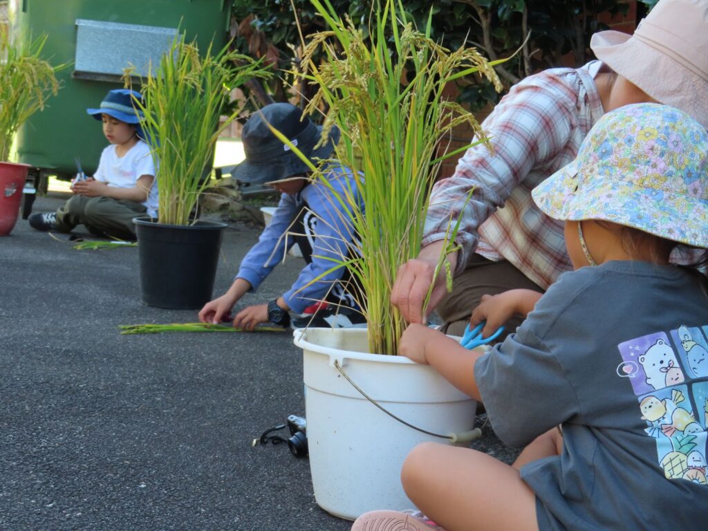 いよいよ稲刈りの時間です。片手で稲の根元の部分を持ち、はさみで上手に切っていきました。
