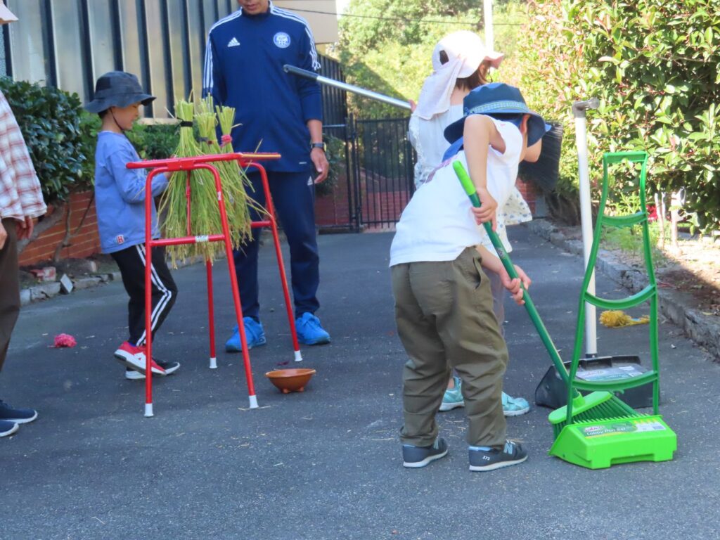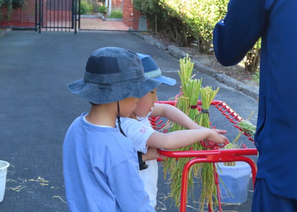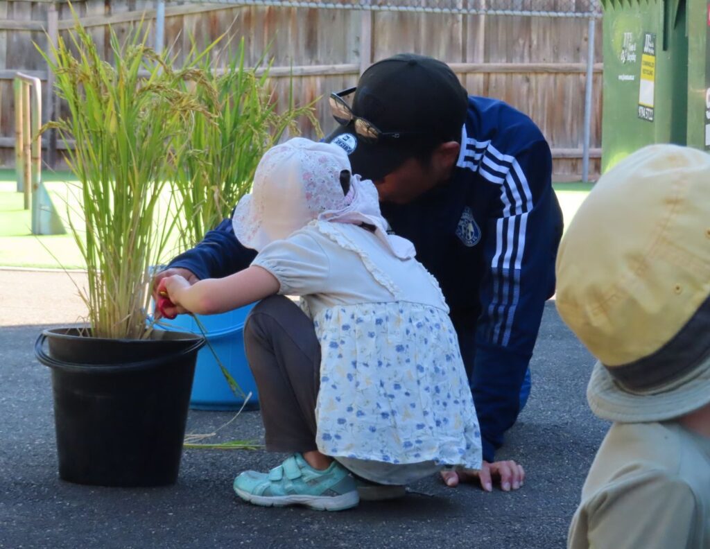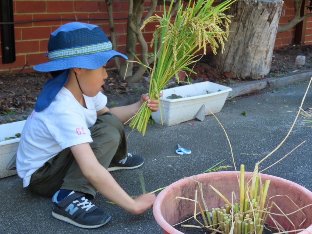切った稲の穂を上手にたばねて、天日干しします。最後はもちろんお片付けも!オーストラリアのお日様の力で十分に乾燥したら、次はもみ殻を取って白いお米にする脱穀の作業、そしてそのお米を炊いてみんなでいただく予定です。長い間、心を込めて育ててきたお米ですから、きっとおいしいでしょうね。プレップもG1も今から楽しみにしています。
