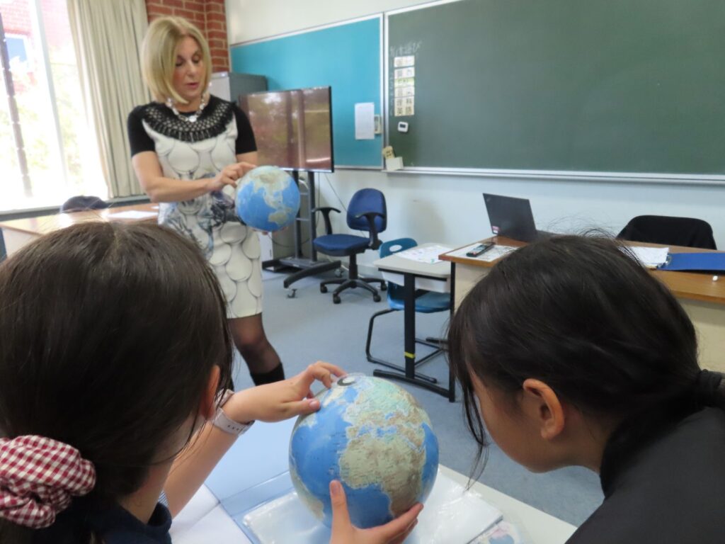 もう一つのクラスでは、現在起きている世界の時事問題を取り上げ、地球儀を見ながら、自分の考えを述べ合っていました。地球儀を眺めて地勢を確認したり、国同士の関係性を考えたり、現在起きている争いについて知っていることや感じていることを話したり・・・もちろん英語で!!小学校高学年の児童ですが、世界のニュースをよく知っているなあと感心しました。そして、世界の平和を願う子供たちの熱い想いが伝わってくる授業でした。